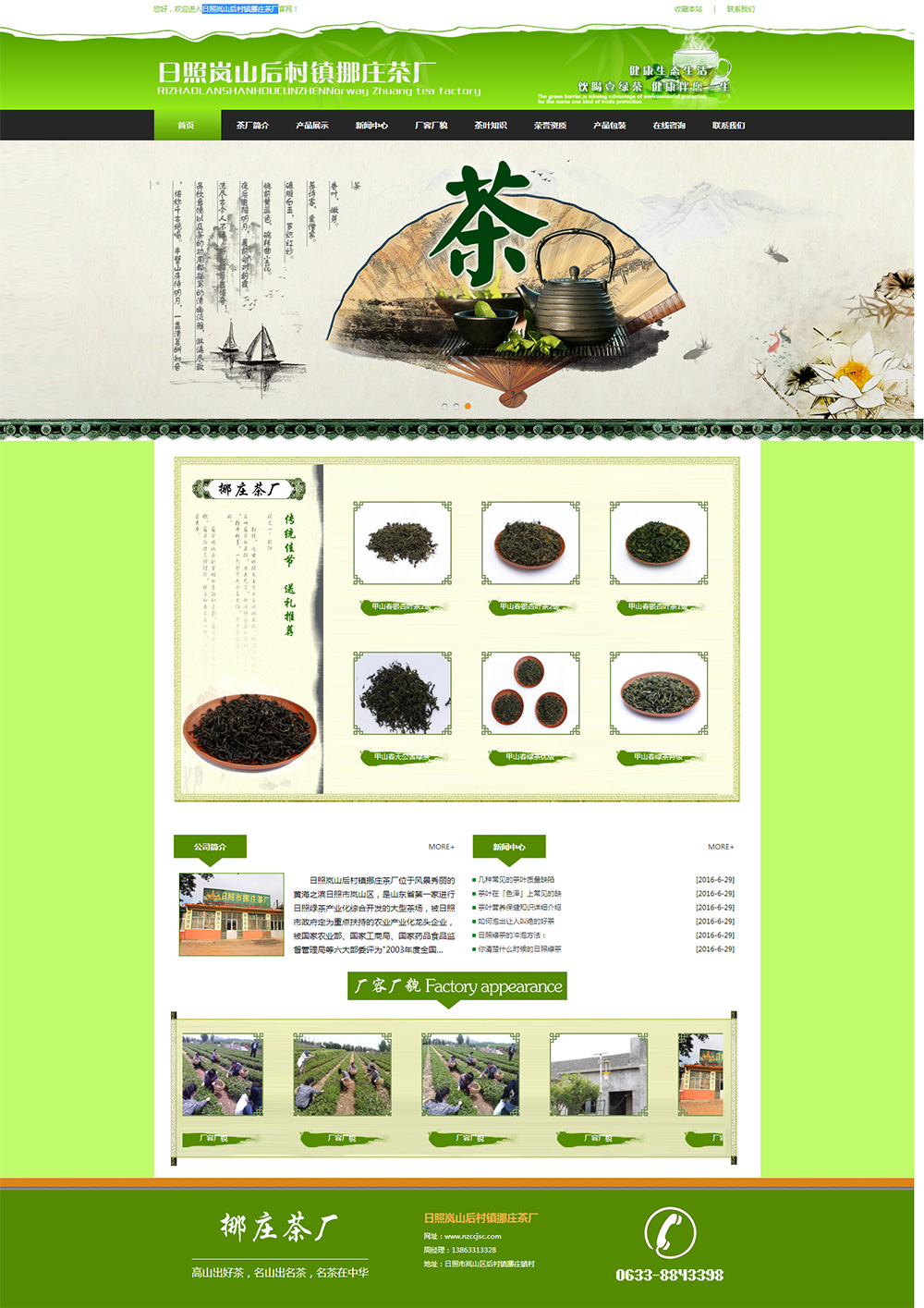 • 日照嵐山后村鎮(zhèn)挪莊茶廠位于風(fēng)景秀麗的黃海之濱日照市嵐山區(qū),是山東省第一家進(jìn)行日照綠茶產(chǎn)業(yè)化綜合開發(fā)的大型茶場,被日照市政府定為重點(diǎn)扶持的農(nóng)業(yè)產(chǎn)業(yè)化龍頭企業(yè),被國家農(nóng)業(yè)部、國家工商局、國家藥品食品監(jiān)督管理局等六大部委評為"2003年度全國食品安全示范單位"中的唯一茶葉企業(yè),被中國食品檢驗(yàn)協(xié)會評為"國家質(zhì)量檢測合格產(chǎn)品",被日照市工商局、質(zhì)量技術(shù)監(jiān)督局、衛(wèi)生局等多家單位聯(lián)合評為"日照市消費(fèi)者滿意單位"等榮譽(yù),被中國消費(fèi)者基金會評為"中國消費(fèi)者信譽(yù)品牌",2005年在中國第三屆(日照)國際茶博覽會名優(yōu)茶評選中再