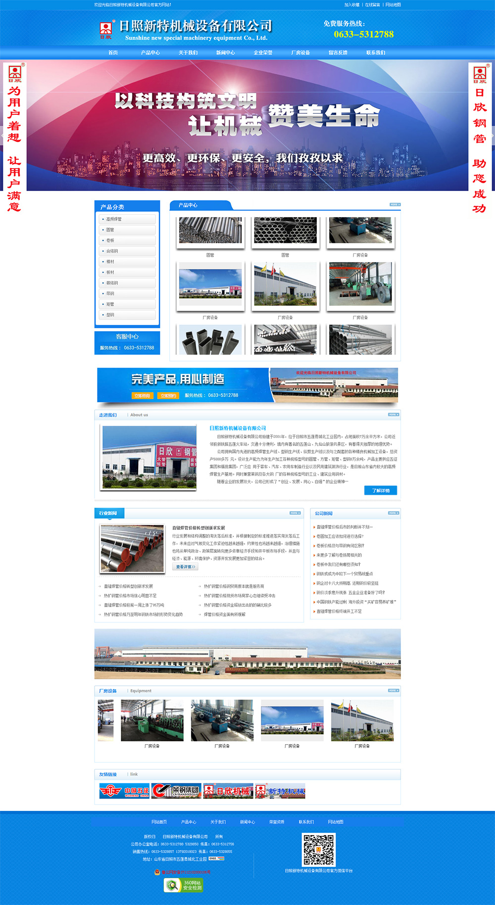 • 日照新特機械設備有限公司始建于2001年,位于日照市五蓮縣城北工業(yè)園內(nèi),占地面積7萬余平方米,公司近鄰膠新鐵路五蓮火車站,交通十分便利,境內(nèi)有著名的五蓮山、九仙山旅游風景區(qū),有著得天獨厚的地理優(yōu)勢。 公司擁有國內(nèi)先進的高頻焊管生產(chǎn)線、型鋼生產(chǎn)線、縱剪生產(chǎn)線以及與之配套的各種精良機械加工設備,總資產(chǎn)5000多萬元。設計生產(chǎn)能力為年生產(chǎn)加工各種規(guī)格型號的圓管、方管、矩管、型鋼8萬余噸,產(chǎn)品主要供應五征集團和福田集團,廣泛應用于客車、汽車、農(nóng)用車制造行業(yè)以及民用建筑裝飾行業(yè),是目前山東省內(nèi)較大的高頻焊